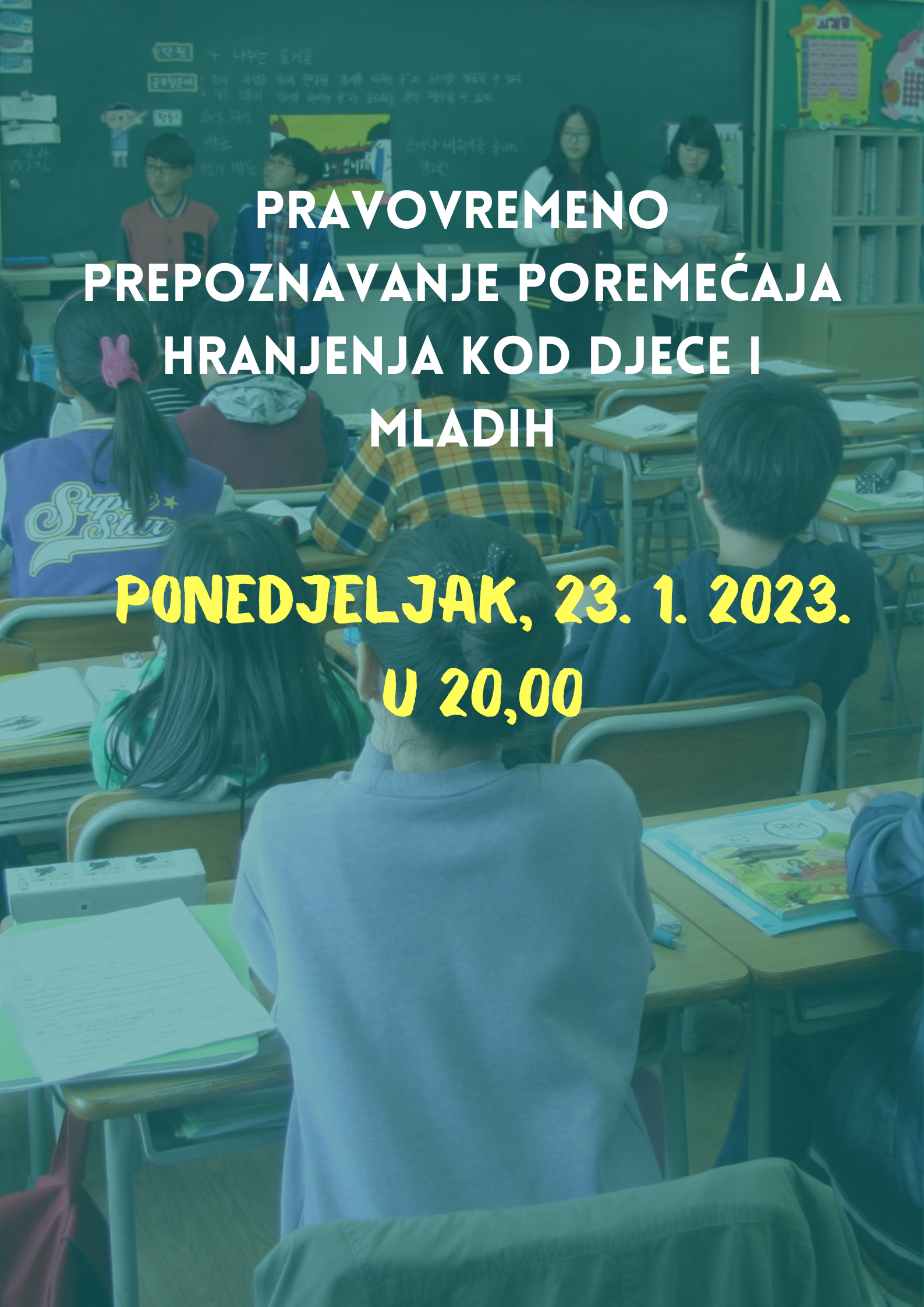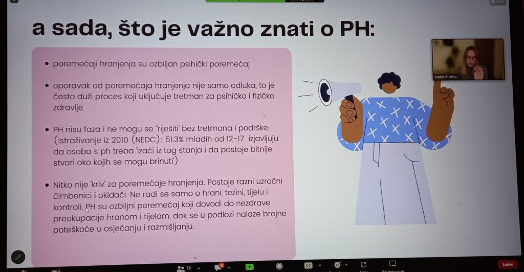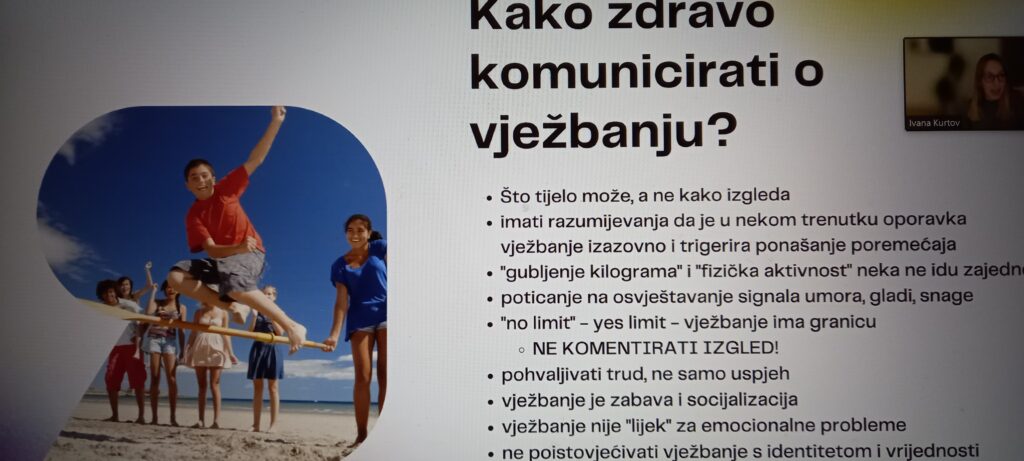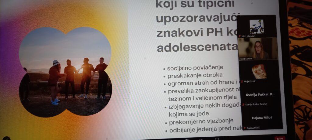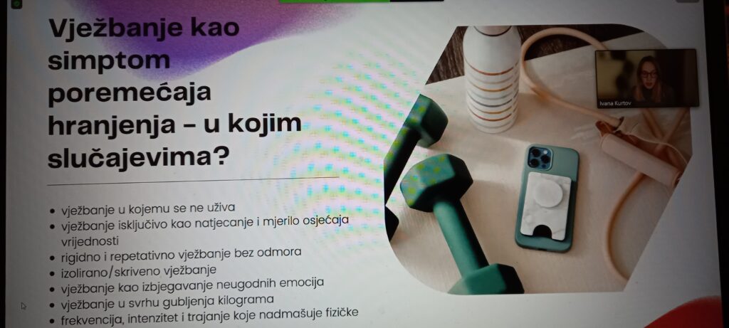 Izuzetno zanimljivo predavanje za našu Udrugu pripremila je socijalna pedagoginja Ivana Kurtov. Ona je, ispred Centra za poremećaje hranjenja izložila temu “Pravovremeno prepoznavanje poremećaja hranjenja kod djece i mladih”. Koji su mitovi o poremećaju hranjenja, što povećava rizik za njihovo razvijanje, po čemu ih prepoznati, koji je postotak osoba s ovim poremećajem i još mnogo toga doznali smo i spoznali da se moramo sustavno educirati budući da svakodnevno radimo upravo sa skupinama mladih koji su u povećanom riziku. Nama je posebno bilo zanimljivo da i vježbanje u nekim slučajevima može biti simptom ovog poremećaja.